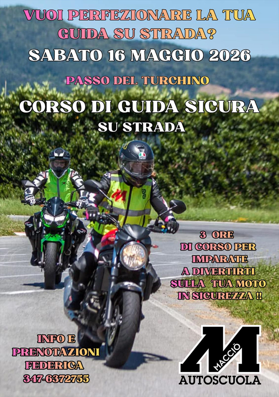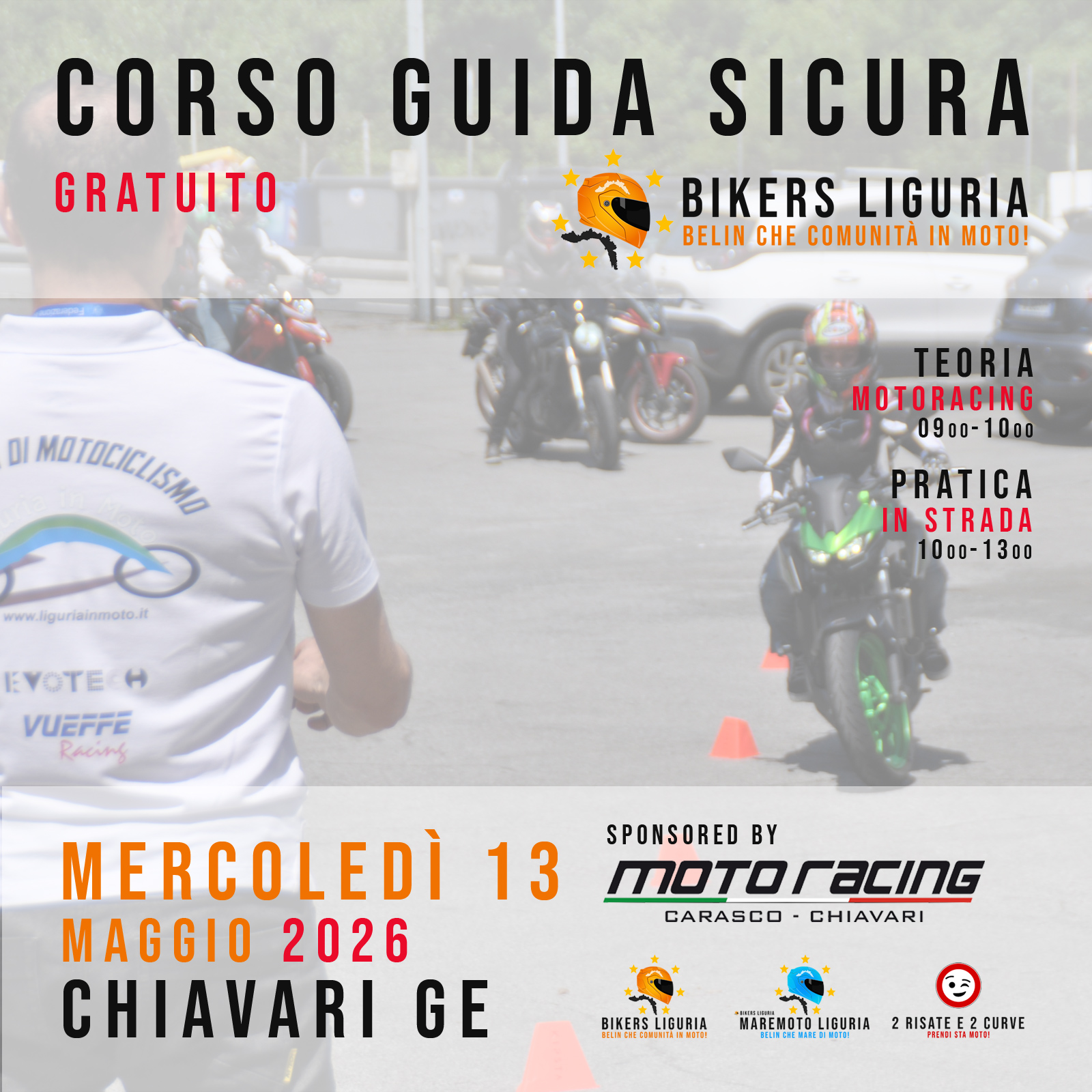 Free safe driving course for 5 community members, held by LIGURIA IN MOTO and hosted by MOTORACING. Theory at the dealer and practice session around CHIAVARI. Course open to all brands.