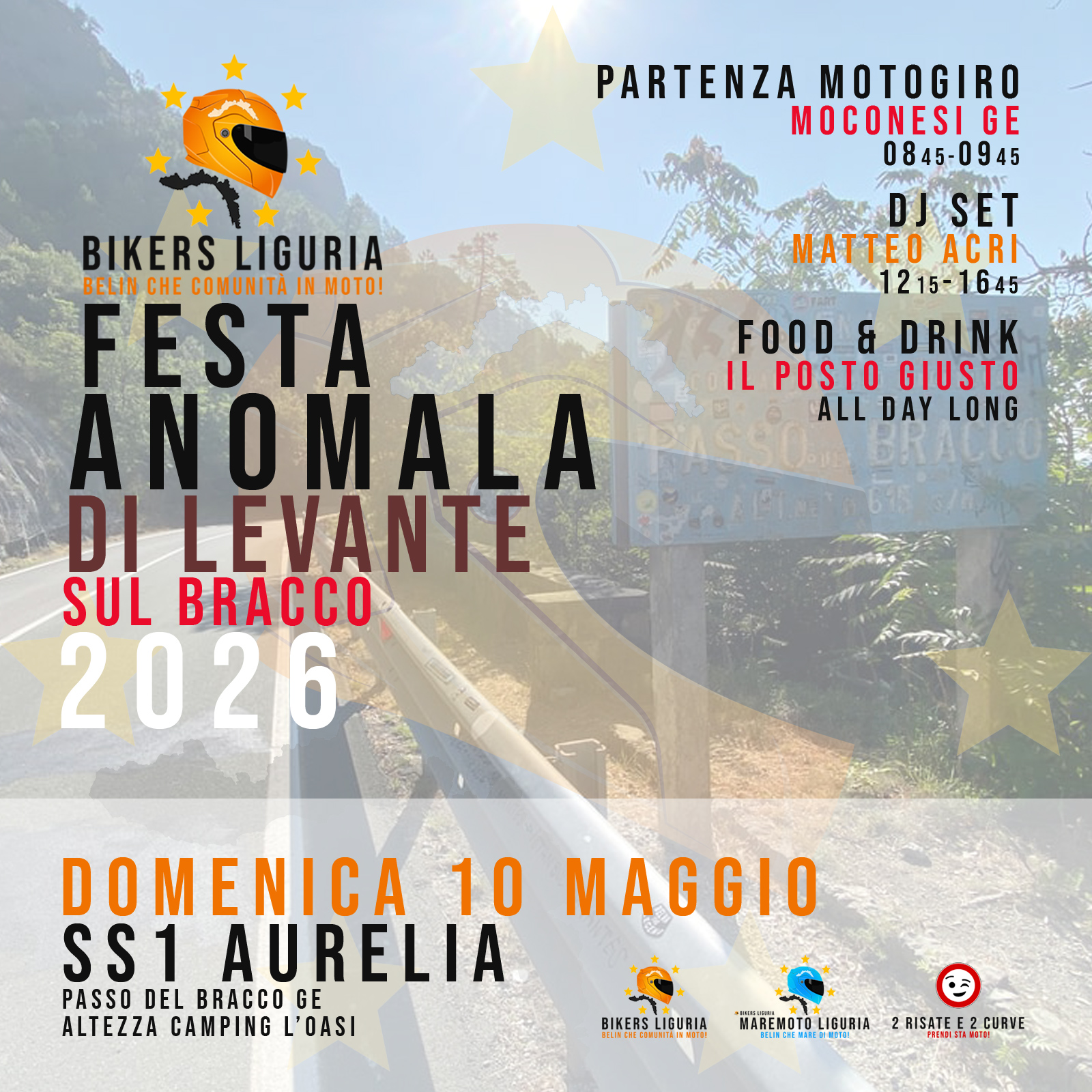A BIKERS LIGURIA mototour will take you at the EAST SIDE ANOMALOUS PARTY AT BRACCO, where we will celebrate the arrival of the warm season! From 12:15 to 4:45pm the DJ Set with our biker Matteo Acri will let us dance on the most famous pass of Eastern Liguria, and if you become hungry, save money to eat by using a BIKERS LIGURIA Discount Voucher for IL POSTO GIUSTO!