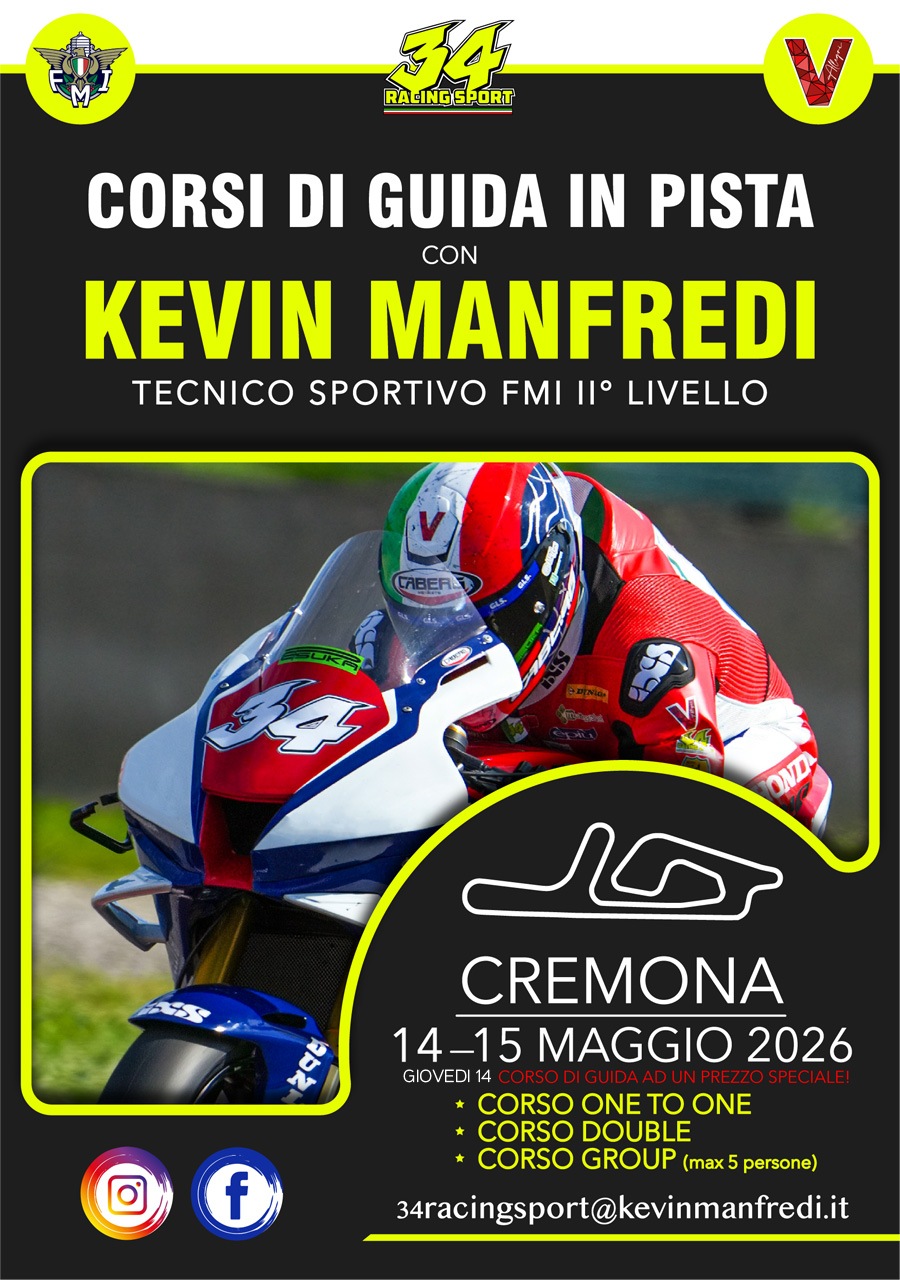 Thursday 14th (with special price!) and Friday 15th at Cremona Circuittrack driving course with Kevin Manfredi, 2 times european champion World SuperSport Challenge 600. One-to-one, double or group with minimum 5 participants. Book your course with the BIKERS LIGURIA 5% discount Voucher.