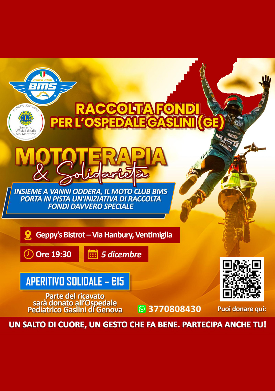 Santas on motorbikes by Luciano and Lella. Charity event to raise funds for the Cresci Foundation, in support of the Paediatric Department of the IRCCS Gaslini Hospital in Savona. Participants must be dressed as Santa Claus. Meet from 11 a.m. to 1:45 p.m. at the Zinola company in Savona. The motorbike tour will depart at 2 p.m. and travel through the streets of Savona and neighbouring municipalities, followed by a return to the company and an aperitif.