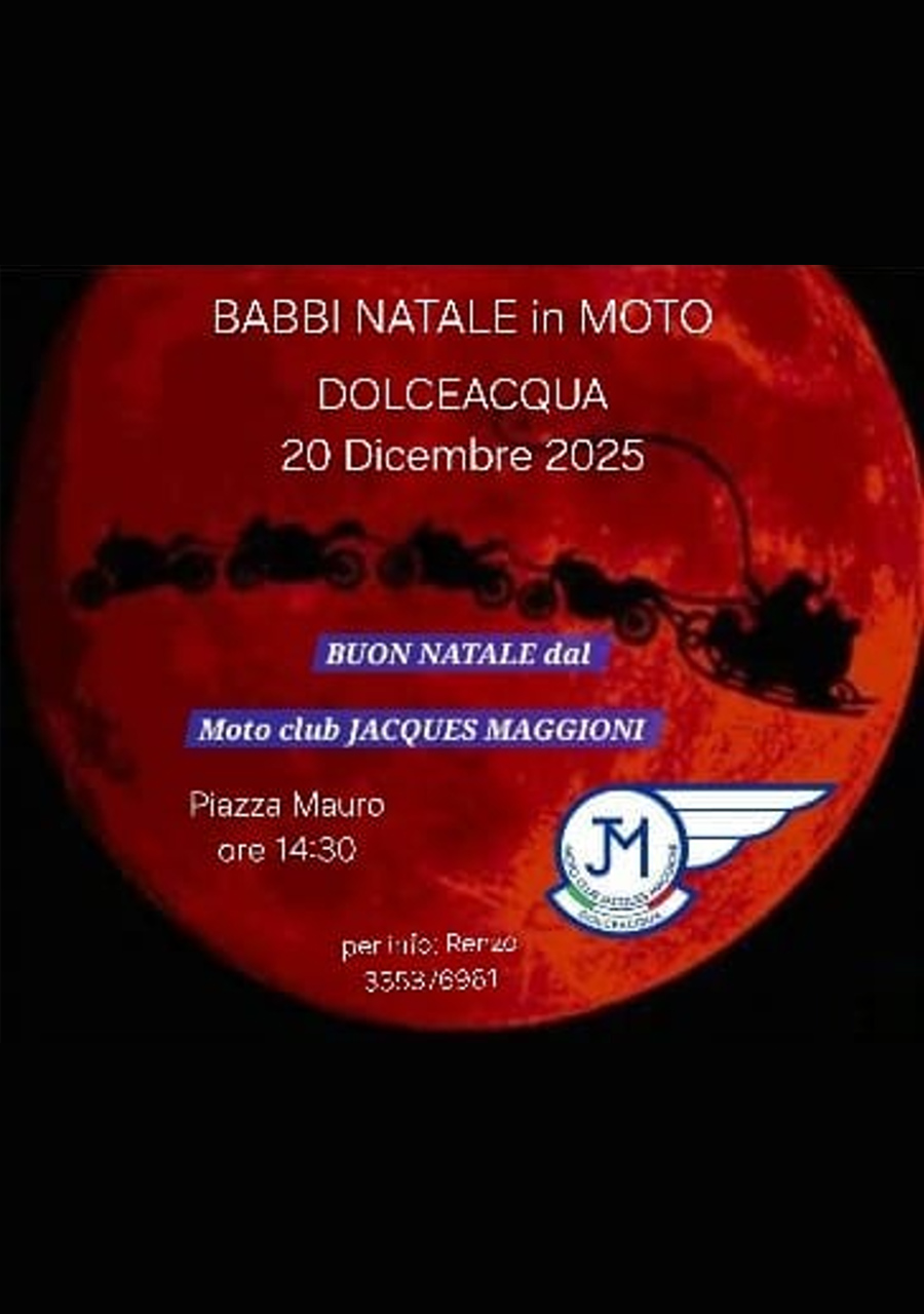 Santas on motorbikes organized by Motoclub Jacques Maggioni. The parade will depart from Piazza Mauro in Dolceacqua at 2:30 p.m..