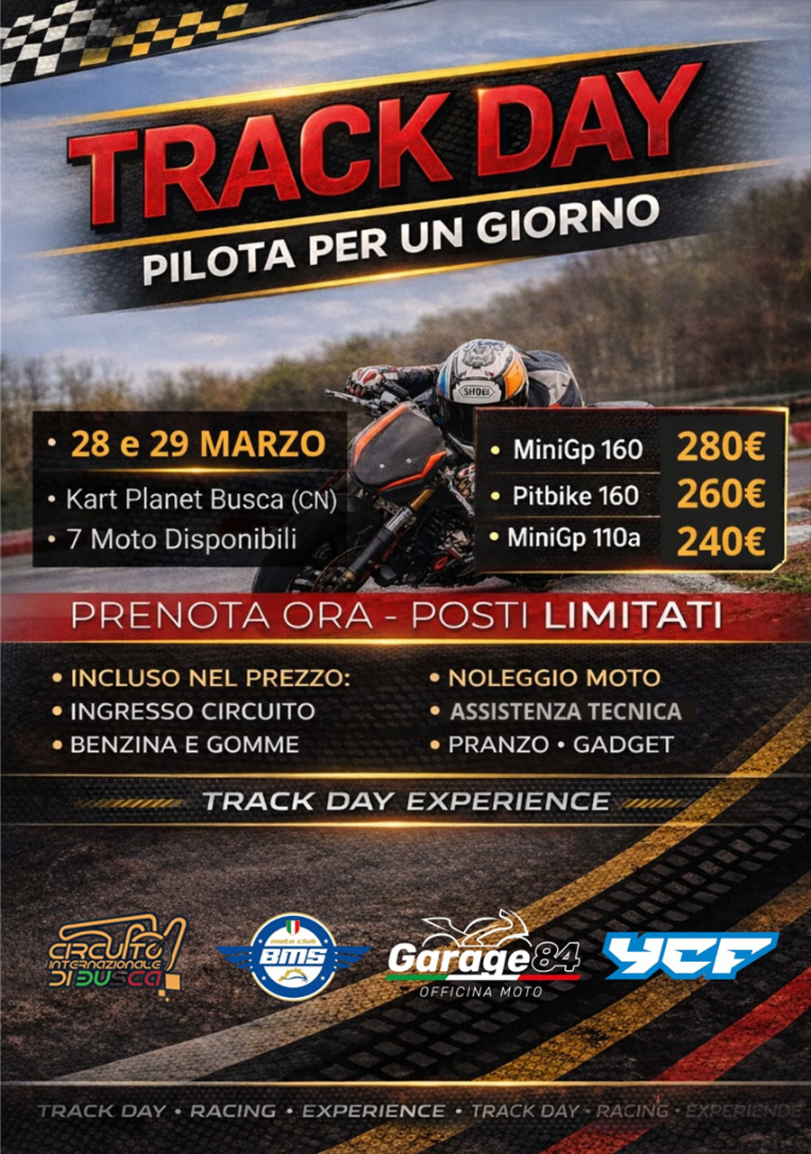 Saturday 28th e Sunday 29th at Kart Planet Busca Track Day with Formula Exclusive includes choice of your Pitbike or MiniGp, circuit entry, fuel and tyres, technical assistance, lunch and gadgets. Book with the BIKERS LIGURIA voucher to get 5% discount.