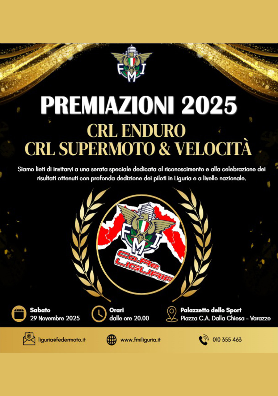 Award ceremony organised by the FMI regional committee for the results achieved by Ligurian riders in the CRL Enduro, Supermoto & Speed championships, starting at 8 pm at the Palazzetto dello Sport in Varazze.